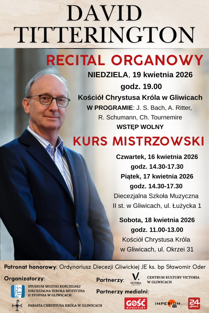 David Titterington to wybitny brytyjski organista, kierownik katedry organów w Królewskiej Akademii Muzycznej w Londynie, dyrektor artystyczny Międzynarodowego Festiwalu Organowego w St Albans oraz profesor Uniwersytetu Londyńskiego. Studiował na Uniwersytecie Oksfordzkim, po czym kontynuował naukę w Paryżu pod kierunkiem Marie-Claire Alain i Susan Landale w Conservatoire de Reuil-Malmaison, gdzie otrzymał nagrodę „Premier Prix”. Kształcił się także w Pradze u wybitnego kompozytora Petra Ebena, dokonując prawykonań jego utworów. Międzynarodowa kariera Davida Titteringtona obejmuje występy na najważniejszych festiwalach świata, od Sydney i Hongkongu po liczne estrady europejskie. Regularnie koncertuje w prestiżowych salach, takich jak Royal Albert Hall czy Royal Festival Hall. Słynie z prawykonań dzieł współczesnych kompozytorów, m.in. Diany Burrell, Petera Dickinsona, Paula Pattersona, Sally Beamish. czy Stephena Montague. Przez osiemnaście lat prowadził coroczne kursy mistrzowskie i recitale podczas Dartington International Summer School. Jako pedagog i promotor młodych talentów jest profesorem wizytującym na uczelniach w Tokio i Seulu oraz współzałożycielem fundacji Eric Thompson